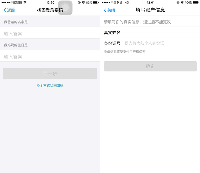 这6台手机均使用的是10.0.1版本的支付宝,但在验证方式上却出现了不同,似乎是与用户个人信息完整度有关。
